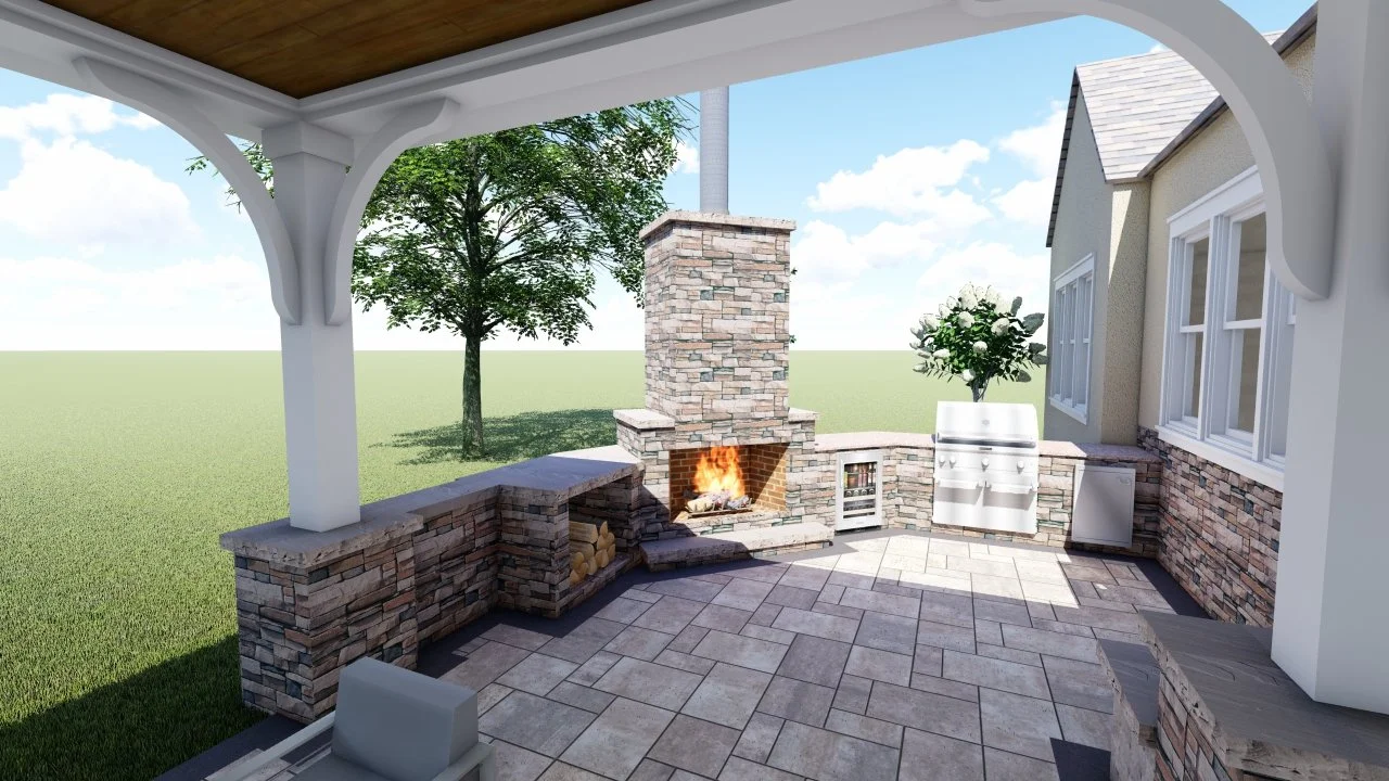 A Cozy PatioThis cozy patio features a charming pavilion, a crackling fireplace, a fully equipped outdoor kitchen, and a steaming hot tub, creating an inviting retreat for relaxation and entertaining.